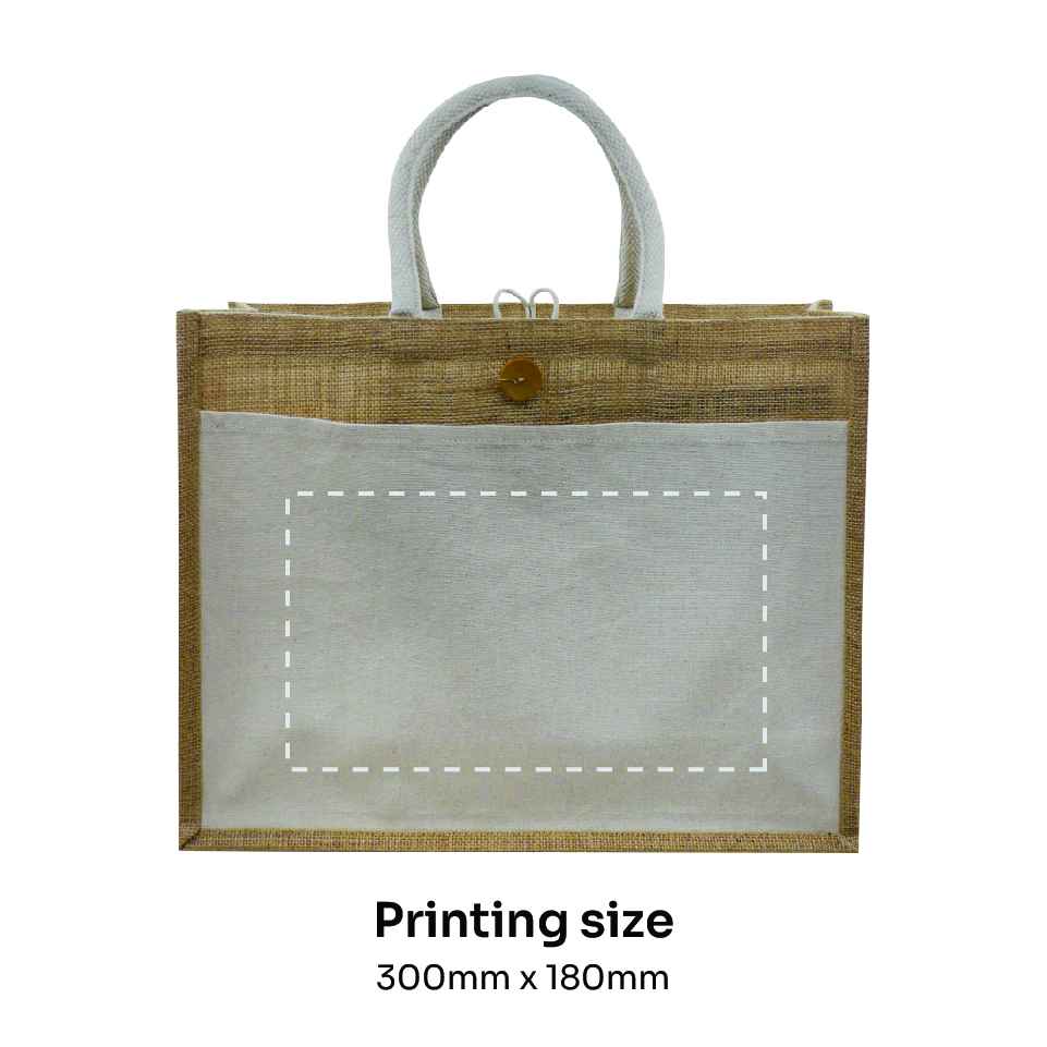 Detailed Description: – Sustainable Materials: Made from jute with a canvas pocket, this bag is an environmentally friendly alternative. – Stylish and Durable: The combination of jute and canvas provides durability and a chic, natural look. – Generous Size: With dimensions of 43 cm (width), 34 cm (height), and 14.5 cm (breadth), it offers ample space for your belongings. – Lightweight Construction: Despite its sturdy build, the bag weighs only 253 grams, making it easy to carry. Perfect for: – Environmentally conscious individuals seeking a practical and stylish bag – Shoppers looking for a reliable and spacious tote – Professionals needing a durable bag for daily use – Gift-givers wanting an eco-friendly and fashionable present